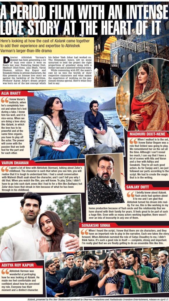 Filmmaker Yash Johar’s fifteen-year-old dream project ‘Kalank’ had been revived by his son Karan Johar in early 2018; which has been directed by Abhishek Varman of ‘2 States’ fame. The multi-starrer will star the much-loved ‘Saajan’ jodi of Madhuri Dixit and Sanjay Dutt , current crazes Alia Bhatt and Varun Dhawan beside Aditya Roy Kapur and Sonakshi Sinha.